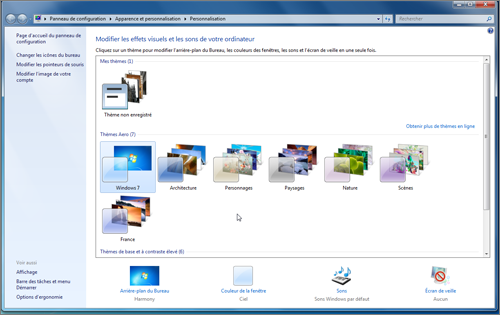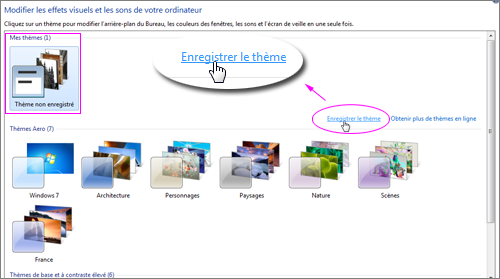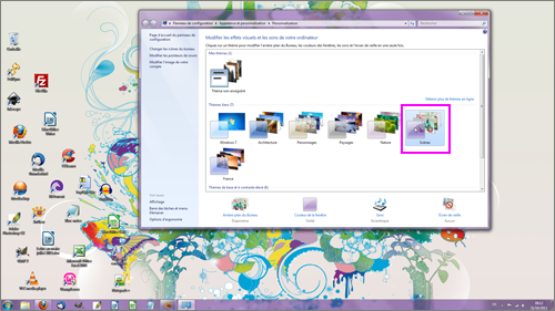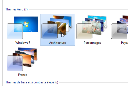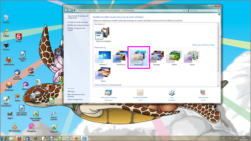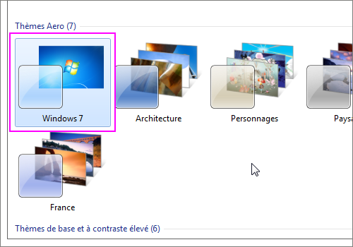 Windows propose un certain nombre de « thèmes ». Celui qui est activé ici (encadré ) est le thème par défaut de Windows 7.