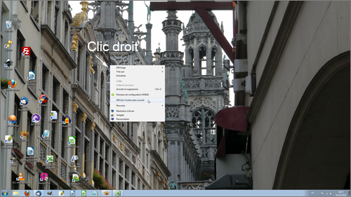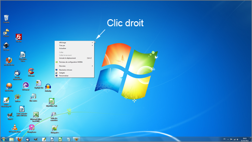 Pour cela, nous utiliserons la méthode la plus simple : un clic du bouton droit de la souris sur une zone neutre du bureau (pas d’icône) :