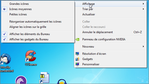 Sur le menu contextuel survolez (sans cliquer) l’option « Affichage ». Vous devriez alors voir apparaître un « menu en cascade » ; ce dernier vous donne la possibilité de modifier la taille des icônes, de les ranger automatiquement ou encore des les ordonner de façon très stricte en colonnes (« Aligner les icônes sur la grille ») :