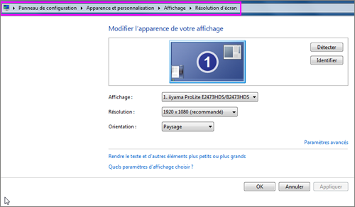 Il s’agit de la rubrique du panneau de configuration (que nous verrons prochainement de façon plus détaillée) concernant la résolution de votre écran ; observez la barre d’adresse de la fenêtre (ci-dessous encadré en rose) :