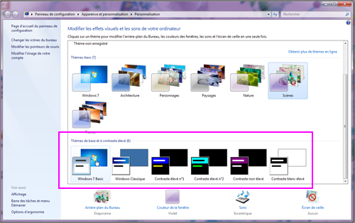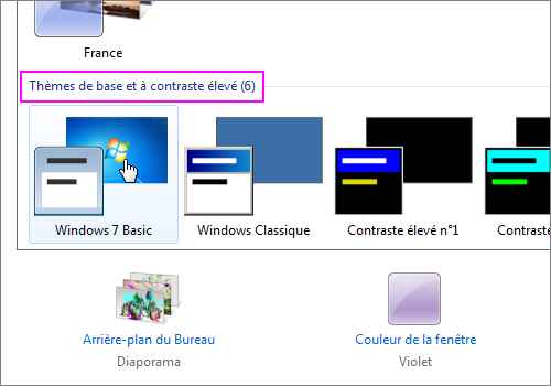 Vous devez trouver une rubrique « Thèmes de base et à contraste élevé ». Cliquez sur le thème « Windows 7 Basic » :