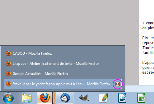 Pour fermer le groupe d’un seul coup, il faut faire un clic droit sur l’icône, puis, sur le menu contextuel, choisir l’option « Fermer toutes les fenêtres » :