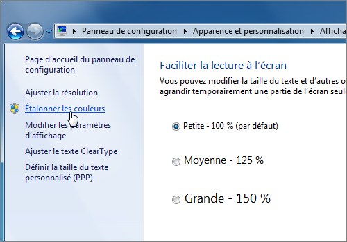 Sur le côté gauche, en dessous de la rubrique « Résolution » (que nous avons vu précédemment), vous trouverez une rubrique « Étalonner les couleurs ». Ceci vous permettra de régler correctement le contraste, la luminosité et le gamma de votre écran.
