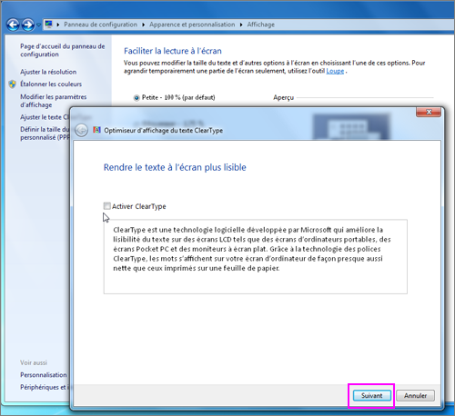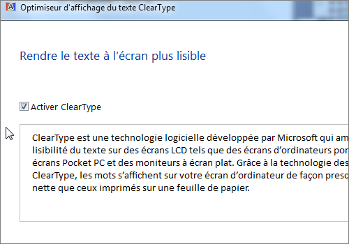 Par contre, cliquons sur cette autre rubrique, « Ajuster le texte Clear Type », afin de montrer la logique générale d’un assistant de réglage du panneau de configuration :