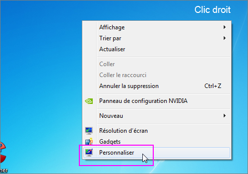 … afin de revenir au bureau et faisons à nouveau un clic du bouton droit de la souris pour, cette fois-ci, choisir l’option « Personnaliser » :