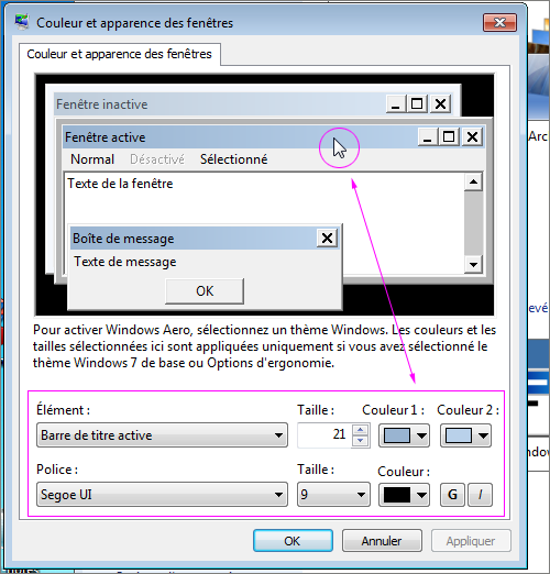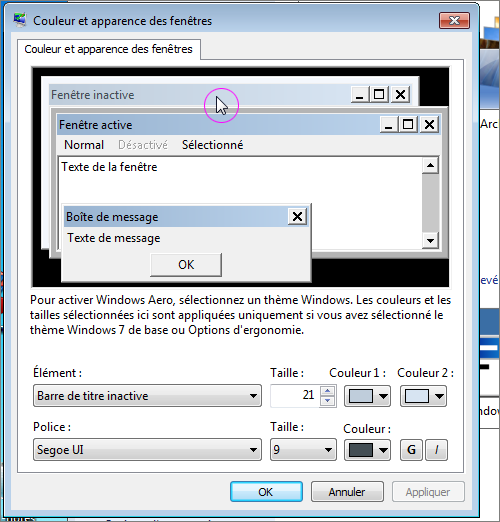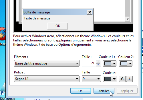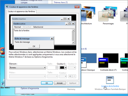 C’est grâce à ce réglage qu’il est possible de modifier complètement l’apparence visuelle de l’interface de votre système (en cliquant sur les paramètres placés dans la parie inférieure) … au risque de se crever les yeux avec des couleurs des plus fantaisistes (il m’est ainsi arrivé de voir de magnifiques fenêtres rouges avec du texte vert).