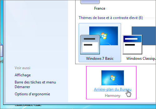 Toujours en bas de votre panneau de configuration « Thèmes », cliquez sur la rubrique « Arrière-plan du Bureau » :